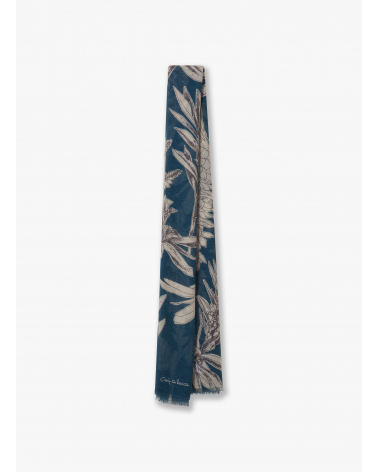 Maxi blue cotton and linen scarf with floral pattern