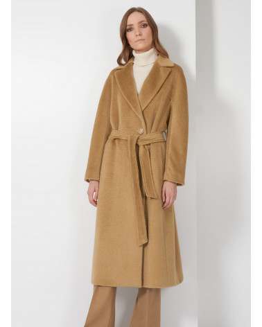 Langer Bindegürtel-Mantel aus Alpaka und Wolle in Camel