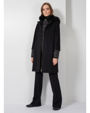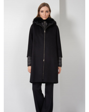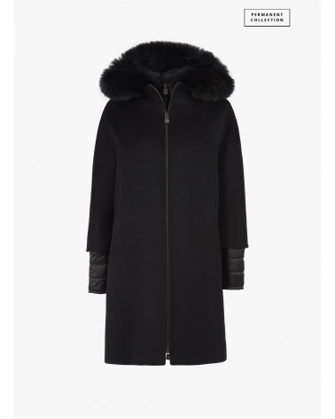 Woll-Parka mit Nylon-Details und Kapuze in Schwarz