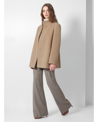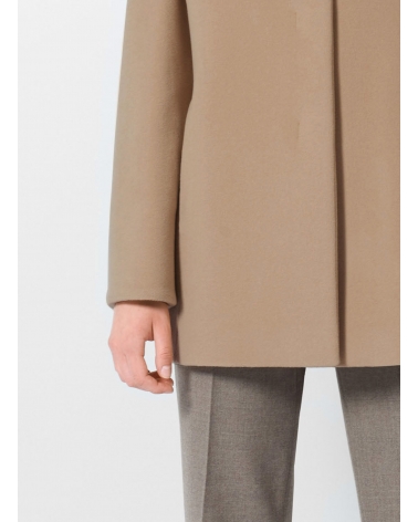 Short light camel wool and cashmere coat with high stand up collar